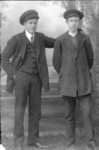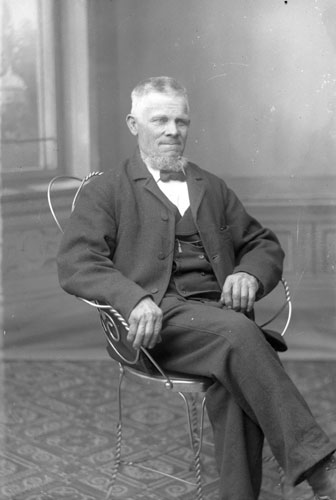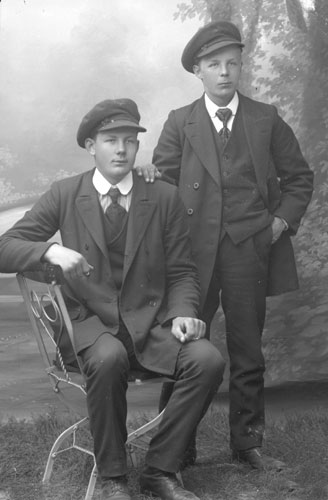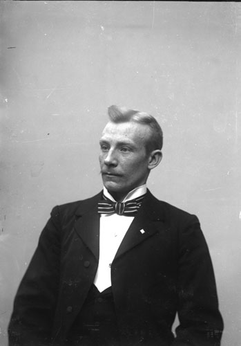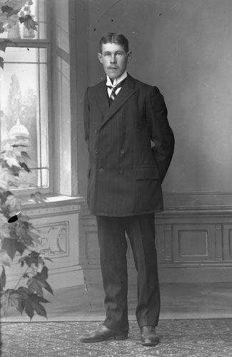 Bildtext: Enligt osäker tolkning av notering direkt på glasplåten: Liv, vars fader var föreståndare för ålderdomshemmet. Bildsynpunkt meddelar: Olle (gifte sig med Astrid Sjödin) eller Ante Liv. Båda var dräng på ålderdomshemmet, där fadern var föreståndare