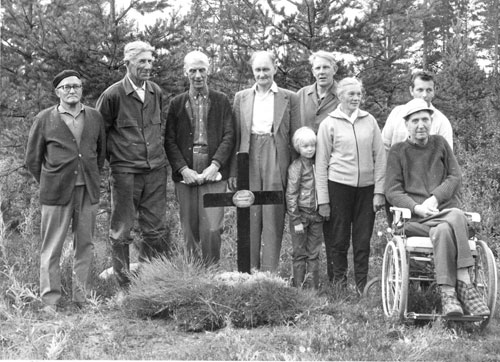 Bildtext: Släktträff. Övre rad: Per-Erik Englin, Tonny (Antonietta)Gustavsson, Henning Gustavsson, Mattias Henriksson, Karl Eriksson, Henrik Zettlin. Andra raden: Henrik Andersson, Elin Andersson, Elvira Högblom, Kalla Svensson, Kristina Henriksson, Anna-Greta Mattsson, Anna-Britta Eriksson, Emma Englin, Kalla Enqvist, Kalla Enbom, Lisen Zettlin, Per Mattsson, Åkerlund. Nedre rad: Märta Westling (Gustavson), Gunn Högblom, Margit Andersson, Jonas Andersson, Tilda Andersson, Bengt Andersson, Bertil Gustavsson, Erik Gustavsson, Ingrid Gustavsson. Kortet taget i Änga, "Löke". Se även bild karv-338