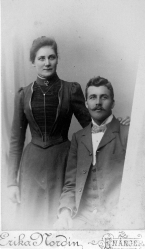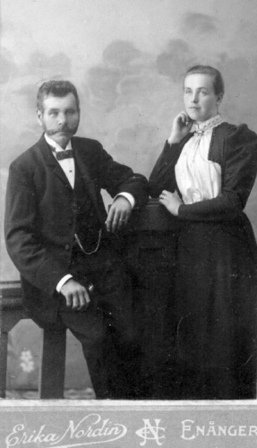 Bildtext: Andreas Åkers familj. Inkommen bildsynpunkt lämnar följande historik: Andreas var i USA 1910-1913. Yngsta barnet på bilden, Jon-Olof f 1910-03-23, därför Andreas inte med på fotot då han åkte till Amerika 1910-04-02. Han kom hem igen 1913-06-28. Se bild nr: en-e-104. Släkten samlad en månad efter återkomsten. Jon-Olof flyttar till USA 1927-12-28 och stannar där, avlider 1993 i Carson City Nevada. Hans fru Violet Beeton avlider 2006 samma ort. Båda begravda i Utah där frun har sin släkt. Hans äldre bror Per-Erik f 1904 flyttar till Amerika 1924-09-03. Till New York 30 sept med båten Oscar II från Köpenhamn slutdest. Sacramento, California. Jobbade bl. a som fåraherde med sin bror Jon-Olof. Åter till Enånger senast 1932 då sonen Karl Hjalmar föds dec samma år. Planerade att åka tillbaks till USA med fru och barn men frun stoppade det hela. Systrarna Märtha f 1898 och Anna f 1900 utvandrar inte till USA. Gifta i Enånger med Lindblom resp. Zettlin