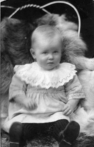 Bildtext: familjebild, tre kvinnor och ett spädbarn, troligen fyra generationer. Kvinnan som står är Karin Sättlin gift med Vilhelm Sjödin, Vedmora. Damen till vänster är Hanna Sättlin. Den sittande damen till höger med barnet är Gunda (Gun) dotter till stående Karin. Gunda gift med Per Andersson (bröpelle) Norrala och barnet i Gundas knä är förmodligen Börje Andersson, bl.a bandymålvakt i Broberg. se även bild en-n-48. Inkommen bildsynpunkt kompletterar: Gunda (Gun) var min mors kusin född 1926-02-17. Eivor (min mor) född 1926-05-27 var dotter till Dagny Sättlin, född 1900-09-29, gift Olsson. Hon fick sonen Börje tidigt. Guns mor Karin (syster till Dagny) född 1904 står bakom och Johanna född 1875 sitter bredvid Gun. Vi har en bild där Gun har Börje i famnen och den är från sommaren 1945.