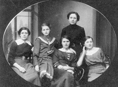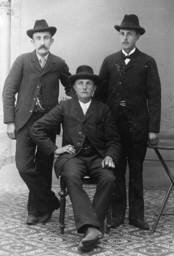 Bildtext: Fotograferat i samband med bröllopet hos Melins i Tosätter. Ferdinand Mohlin (den längre mannen) samt Hanna Kjellin (Bölan) i mitten bland kvinnorna. Anders Olov Hansson, Tosätter, längst t h. EJ Melins enligt inkomna uppgifter. Alternativ???