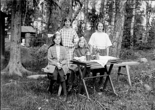 Bildtext: troligen söndagsskola, barn samlade på trappen vid kapellet – nuvarande hembygdsmuseum
