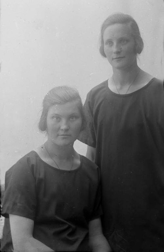 Bildtext: En grupp kvinnor med spinnrockar m.fl verktyg. Några av namnen är: Sigrid Asplund(Persson), Stina Sättlin (Persson), Barbro Landin (Edström). Ingrid Edström, Inga Lisa Egnell, Nilsson, Hilda Paulsson, Astrid Westling, Berta Wedin, Gunhild Frid, Bodin, Barbro Landin, Stina Persson g Edström, Emy Westling g Collin, Iris Olsson, Stina Sundin Plats: Bygdegården. Se även bild ee-8-priv