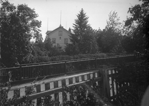 Bildtext: Länsmansbostaden i Svedja, Enånger, " backa gård". Fotograferat från "stora vägen" genom Enånger (kustvägen). Skyltarna på husgaveln tros vara bl.a. postverkets skylt. Byggnaden fungerade ju en tid runt år 1900 som postkontor