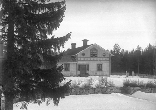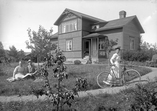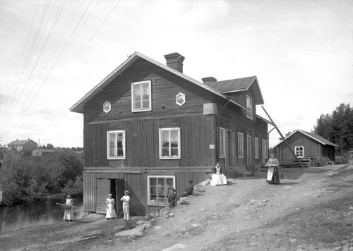 Bildtext: S. Jönssons bageri, café och badhus, senare kallat Sundins café (intill Enångersån), th har vi Mosebacke (Pihlmansberget). Badhuset låg nertill på husets baksida, varmbad kostade 50 öre och ett gyttjebad 1:30. Sittande är bagare Jönssons två söner och frun. Kvinnan med kaffebrickan är Anna Nilsson