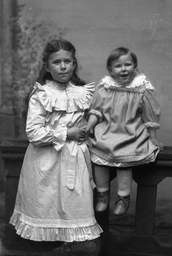 Bildtext: Syskonen Elsa, Fritz och Ruth Söderström, utanför föräldrahemmet i Bäckmora. Föräldrarna var Clara och Per-Johan Söderström. Flickan till höger möjligen en kusin. Se även bild nr: en-r-22 och en-r-89 och en-ah-187 och en-n-135
