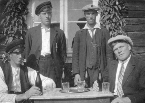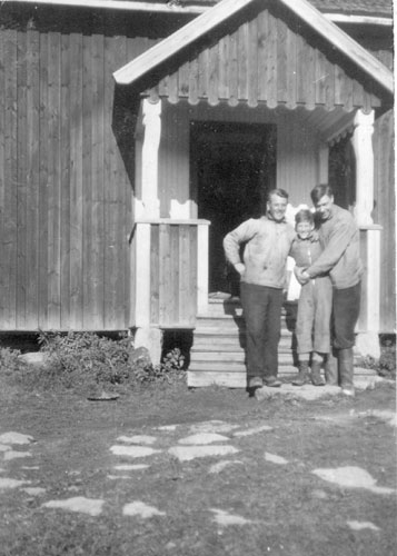 Bildtext: En grupp människor utanför Enströms café och bageri. Fv: Naimi Collin, Tilan Persson, Eve Enström, Gunnar Karlsson, Bertil Åhlberger (distriktschef och televerkets kontrollant), Inga-Britt Asplund, Anny Borin, Ruth Bohlin (g Yggström). Ruth Bolin blev senare telefonist på Iggesunds bruks huvudkontor i Iggesund. Bilden tagen i samband med nedläggningen av manuella telefonväxeln i Enånger. Notera huset i bakgrunden under byggnad efter nuvarande Militärvägen. Se även noteringar till bild nr libe-24