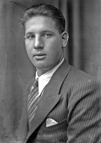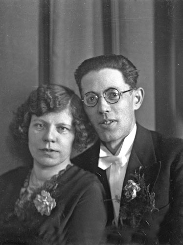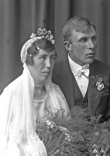 Bildtext: brudparet Fritiof och Augusta Strömgren, Sätra (se även bild en-r-154 med fler). Inkommen bildsynpunkt: Fritiof, känd brunnsborrare, var född 1900 och dog 1968.Han gifte sig 1933 med Augusta, född 1902 i Trönö. Hon dog på Hällgården i Njutånger 1987.