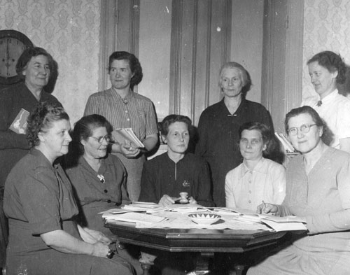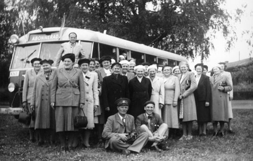 Bildtext: En grupp människor samlade framför en abonnerad buss. Överst: Ingemar Persson, Stående fv: Ulrika Hansson f 1898, Hanna Kjellin f 1887, Anna Sättlin f Kjellin 1897, Hilma Forsman f 1883, Anna Zettlin f Åker 1900, Hilda Forsman f 1901, Isedoria Hermansson f 1885, Elin Melin f Kjellin 1893, Klara Bergman f 1885, Helene Sundström f 1899, Brita ”Briten” Svedman Norrala, Helen Svensson f 1890, Britta Östlund f 1923, Frida Olsson f 1895, okänd, Anna Berg f 1887, Märta Andersson f 1908. Längst fram: okänd chaufför, kyrkoherde Hans Persson