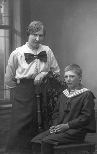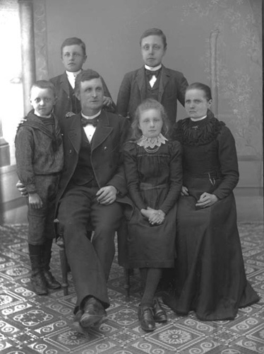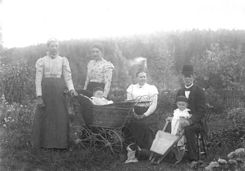Bildtext: Mjölnaren Josef Norlén med släkt och familj, Högbro kvarn, Enånger. Josef avled 19 okt.1981, född 30 okt. 1886. Se även bild en-l-167. Inkommen bildsynpunkt meddelar: Gissningsvis finns Josef Norléns föräldrar med på fotot. Fredrik Olsson Norlén, likaså mjölnare, född i Nora, Västmanland 1852, död i Enånger 1938. Johanna Gustava Ahlström, född i Söderfors, Uppland 1856, död i Enånger 1926. Samt dessutom Josef Norléns syster: Ida Norlén, född i Hedesunda, Gästrikland, 1884, död i Kyrkbyn, Njutånger 1981.