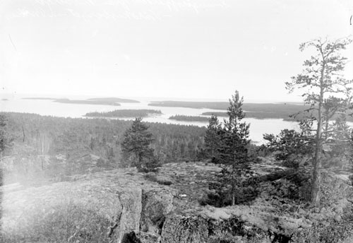 Enångersfjärden sett från Vårdkasberget (Fonkhälle?) vid Borka. De dominerande öarna i centrum av bilder är Flakön, Bergön, Vitön, Bärön, Enhammaren. En bildsynpunkt meddelar följande korrigering av bildtexten: Vårdkasberget är inte Fonkhälle utan en utlöpare av Borkhälle och kallades Vasan.