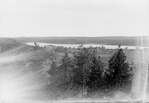 Sökord: vy, sjö, Ångersjön, Sjösveden, Vedmora, kvinna, barn, byggnader
