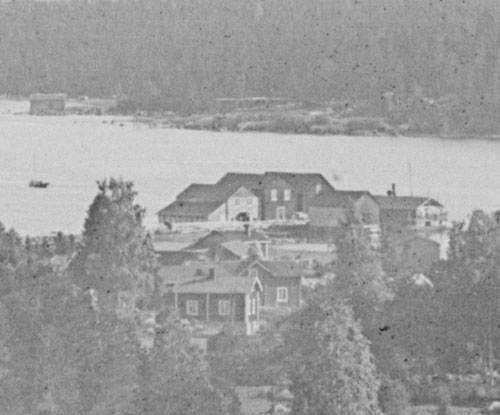 Detaljförstoring ur bild en-l-44 som visar en del av bebyggelsen i närheten av Borka brygga. Byggnaden längst till höger är en fabrik som gjorde kaggar och lådor. Den brann upp efter ett åsknedslag. Rester efter grunden syns fortfarande. Kaggfabriken brann något år före första världskriget och hade byggts av Jonas Östberg. Före kaggfabriken låg här en ångsåg som ägdes av A O Brodin i Åkre. Den brann också ner troligen i slutet av 1800-talet.