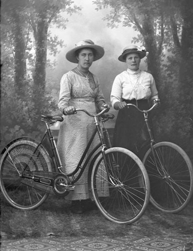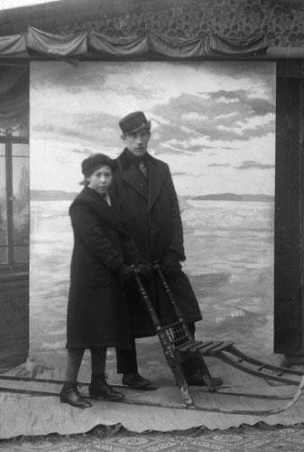 Bildtext: två barn med en spark försedd med sparklåda, Kerstin Svensson och Maj Kerslow. Möjligen utanför Brunlöfska gården med f.d. Francks (Brogård)skymtande