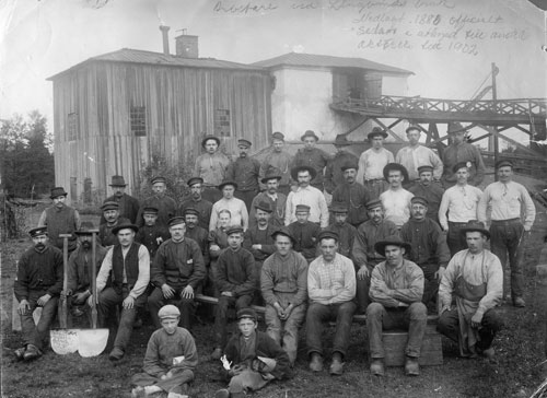 Bildtext: Arbetsstyrkan samlad utanför Långvinds masugn det sista året den var i bruk. Vid detta tillfälle hyrdes och drevs masugnen av Skebo bruk i Uppland medan deras masugn renoverades. Arbetarna är således mestadels från Skebo. Notera uppkörningsrampen för träkol till masugnskransen, uppe till höger. Träbyggnaden inrymmer varmluftsapparat och blåsmaskin (stålbläster). Ett identiskt kort finns utlagt på Långvinds bildapplikation med nummer lt-priv-172