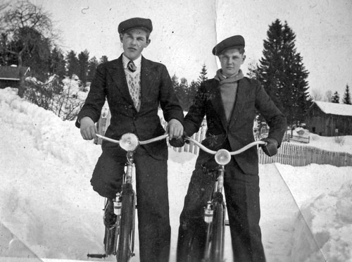 Två män på cykel. Sannolikt två bröder Colling från Haga. Bengt till höger. Kompletterande bildsynpunkt: Söner till Artur Colling f 1895 i Sätra och Rosa Vera Ingeborg f Engvist 1901 i Haga. Artur bonde i Holmen 1 (Haga 4:2) Sönerna med nya fina cyklar, Per Martin f 1921 (flyttade 1940 till Bro i Västmaland) och Bengt f 1929 (gift 1958 med Aina Holm) boende på Haga 4:2.