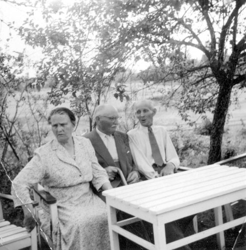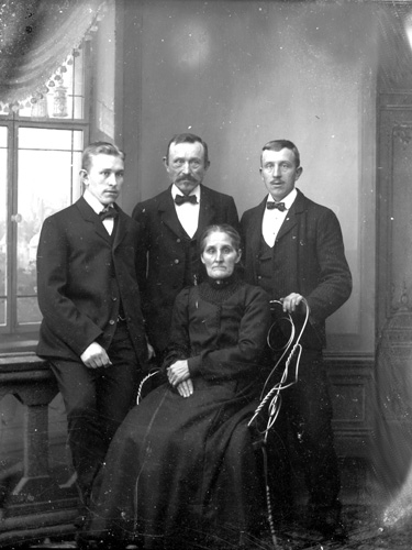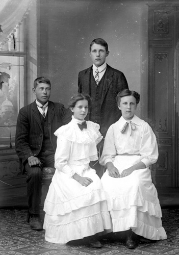Bildtext: Fjälebor. Fr.V Bertil Eriksson, Karl & Karin Åkerlund, Per Jonsson, (skymd Gunnar Eriksson), Erik Eriksson, Johan Åkerlund, Per Eriksson, Alma Fernlund, Signe Östlin, Tilda Jonsson, Jenny Lindfors från Borka, Anna Eriksson, Sonja Åkerlund, Linnea Åkerlund från Finnika, Ann Mari Eriksson, Axel Eriksson, Sture Åkerlund från Finnika, Alve Eriksson, Jenny Eriksson, Per Olov Eriksson, Per Åke Eriksson, Bror Eriksson, Stig Eriksson.
