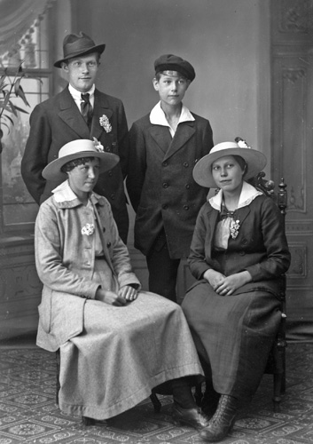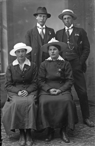 Bildtext: Gruppbild i okänd miljö, släktskap kan finnas med Enångerssläkterna Ville Westling och/eller Rosin. Vissa namn finns noterade: 1 fru Anna Glad, 2 Ante Glad, 3 Anny Andersson, 4 Karl Berg, 5 fru Sallu Ersson(?), 6 Ragnar Jernström, 7 fru Edit Skalman, 8 Marta Eriksson, 9 Ruben Karlsson, 10 Agda Andersson, 11 Marta ”i Backen” Eriksson, 12 Elisabeth Johannesson, 13 Lars Brandt, 14 Johan Hamrin, 15 Alma Johansson, 17 Olle Glad, 18 Anna Karlsson, 20 Nisse Wahlström, 21 fru Hilma Glad, 22 fru Sundström