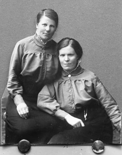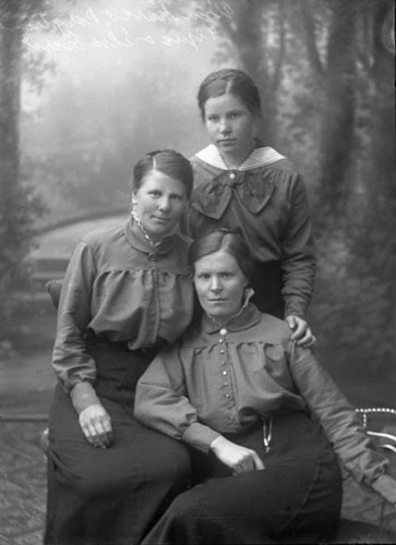 Bildtext: Enligt Eliot Burman urmakare O. Bergströms Elsa (överst), Nederst Helma g Ekroth. I mitten Gerda. detta är dock samma foto som en-h-54, där uppges flickorna heta Nilsson, en annan uppgift talar om att damen överst skulle heta Helma Bergström-Ekrot. En ytterligare teori om identifikationen av dessa kvinnor föreslår "Spetkalle" Sjödins tre döttrar. Förmedlar ytterligare en bildsynpunkt: sittande till höger har vi: