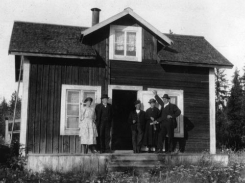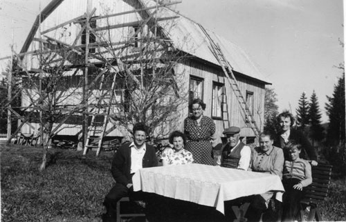 Bildtext: Vedmora 2. Fr.v; Okänd dräng med häst, Gustaf Paulsson(1921-2004)fosterpojk, Kristina Frisk(1877-1957), Ida Rehnström(1902-1990), Eivor Rehnström(1928-2010), och Marta Olsson(1864-1939)fördelsgumma.