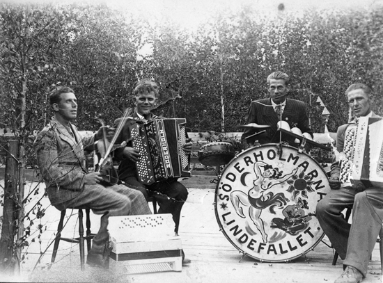 Bildtext: Musikkapellet Söderholmarna på bild. Från vänster Elof Söderholm, Ivar Söderholm, Erik Berg och Alfred Söderholm. Teckningen på trummskinnet är ganska säkert gjord av Elof Söderholm. En liknande bild finns även utlagd bland Bölans bilder sökord: gruppbild, gruppfoto, orkester, män, dragspel, fiol, trumma motivkategori: musikinstrument id:16589 Fotograf: okänt fotoår: 1930-tal bildnummer: besod-067 förening: Enångers Hembygdsförening land: SE motivplats: okänt teknik: Inskannat foto rättighet:(föreningen ovan om ej annat anges.) privat originalplats: (visas ej publikt) släktboken: publiceras: ja säljas: nej tidigare nr: samling: privat skick: ganska bra reg av: HE reg datum: 2026-04-01 |