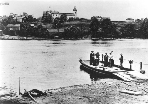 Färjan från Valla till Storbyn 1913. Vikarien Per Nilssin "Bygges Per" drar färjan. |