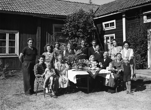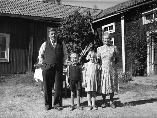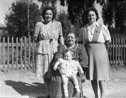 Bildtext: I samband med Brita och P.E. Bäckströms guldbröllop 1947 togs detta kort på fyra generationer. Överst till vänster står Brita Lindberg (född Svedberg, avled i februari år 2009 i Uppsala), hennes mor Betty Svedberg (född Bäckström). I mitten sitter Bettys mor Brita Bäckström med barnbarnsbarnet Elisabeth Lindberg.