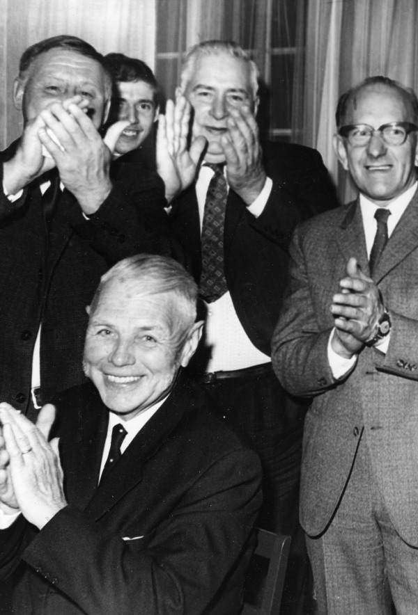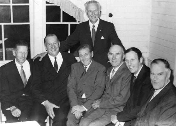 Bildtext: Gökotta vid AnnMarie Hållens stuga på Storberget. De som sitter längst ner till höger är Arne Anderson, Trogsta, dottern Doris gift Eriksson, Flatmo, Anne-Christin Westberg, Stina Anderson, Trogsta, Anne-Margret Westberg, Christa Westberg, Bollnäs, född Clee.