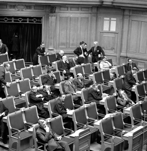 Bildtext: Partimöte vid riksdagshuset. Gävleborgsbänken i andra kammaren fr vänster: Olle Westberg (Njutånger), Gunbjörg Thunvall (Ramsjö), Hans Nordgren (Söderhamn), Okänd, Okänd, John Eriksson (Enånger).