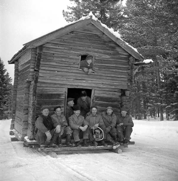 Bildtext: Högs hembygdsförening flyttning av härbre. Margareta Andersson i fönstret tittar ut.
