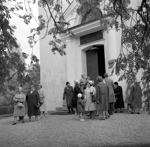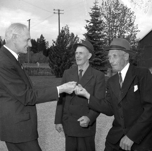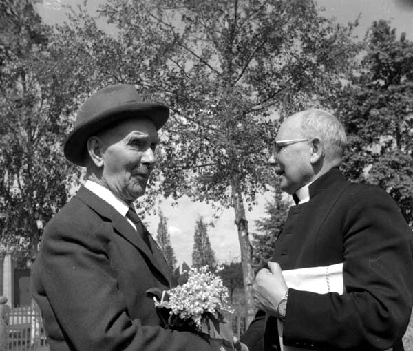Bildtext: Konfirmationsjubileum vid Forsa kyrka. 1897 års konfirmander vid 65-årsjubileum 1962. Från vänster: Helen Persson från Vålsta/Nansta, Anna Mickelsson Berglock, Erik Prim Häggnäs , Brita Olsson från Nygårn i Tövsätter, Olov Klang, Lund, Katrina Olsson Andersgården Långby och Karl Jonsson Näsviken.