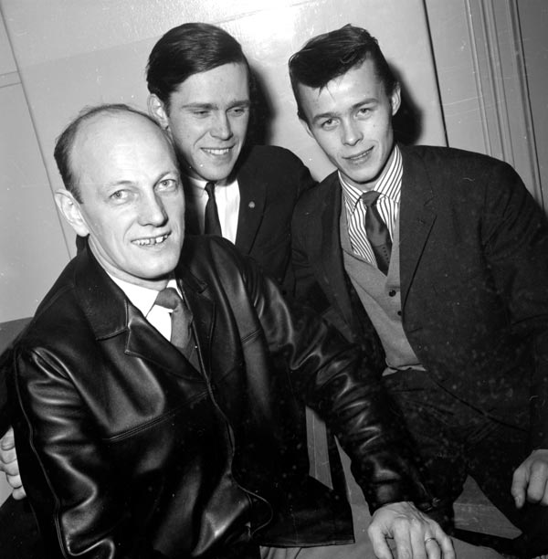 Bildtext: Jordbrukskassan Hudiksvall. Från vänster: bankchef Stanford Jonsson, Kalvhaga, okänd, Hilding Nordin Sörhoga.