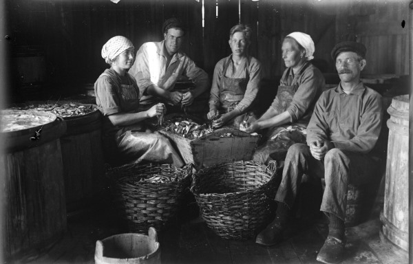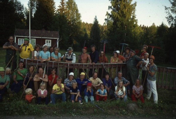 Bildtext: Arbetare vid sågen i Sörforsa, startade 1895, senare ångsåg på 30-talet. Övre raden från vänster: Frans Westlund, Jonas Tärneborg, Erik Gröndal, Lasse Svedberg, Gunnar Norell, Olle Jonsson, Alf Jonssons far, Gunnar Svärd. Andra raden: Delsbo-Jonke, Bror Fors, Ville Gröndal, Gustaf Westlund, Hans Imberg, Pelle Terneborg, Westlund från Trogsta, Nils Eriksson. Nedre raden från vänster: Johan Westlund, Per Terneborg, Per Andersson, Helga Erikssons far, Teodor Svärd, Johan Sköld, Kalle Norell, Kalle Westin Mikje, Olle Jonsson gift med Svea Hedsta, Lindgren gift med en syster till Karin på Kares Cafe