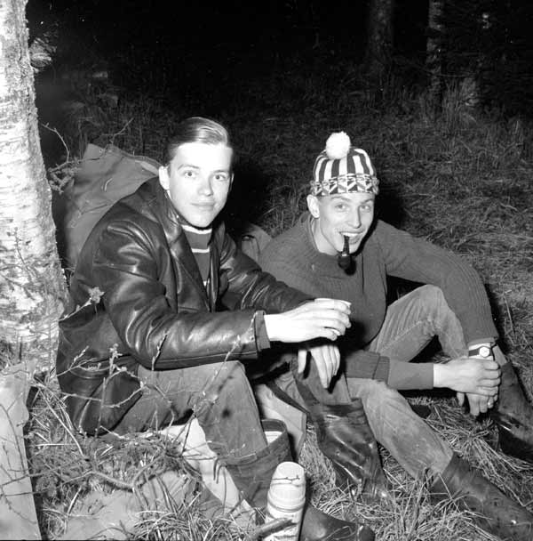 Bildtext: Trogstaskolan klass 3-6 (storskolan). Utflykt 1964 eller 1965. Möjligen den gången vi fick hjälpa till med att röja för skidbacken från Hällbostugan och upp på berget där.