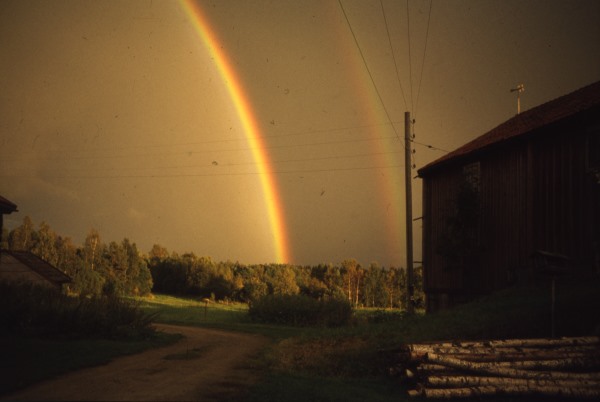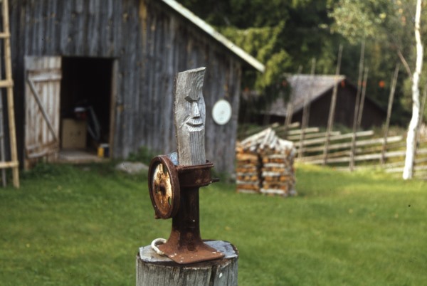 Bildtext: Smedsgårdens stuga på Finnsjövallen. Olof Larsson kisar mot solen.