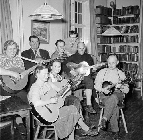 Musikanter vid ungdomsgården. Sittande från vänster övre raden: Signe Thorell, Erik Lövgren, Nisse Wetterling, Ejert Nordgren. Nedre raden från vänster: Karin Wetterlind, okänd, okänd, och Gustav Lindblad.