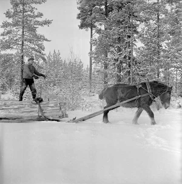 Bildtext: Nils-Erik Ovanfors. Artikel i RLF 15 jan 1958 enligt anteckning på urklippet med samma bild. Bildtext: I en hälsingeskog just nu så vacker som ett julkort, driver arrendator Nils-Erik Ovanfors Forsa timmer. Det är hans andra år som körare, men 14-åriga Maja, som här drar massavedslasset, inkl. husbonden, har förstås varit med betydligt fler vintrar i skogen. Se även PH004-093.