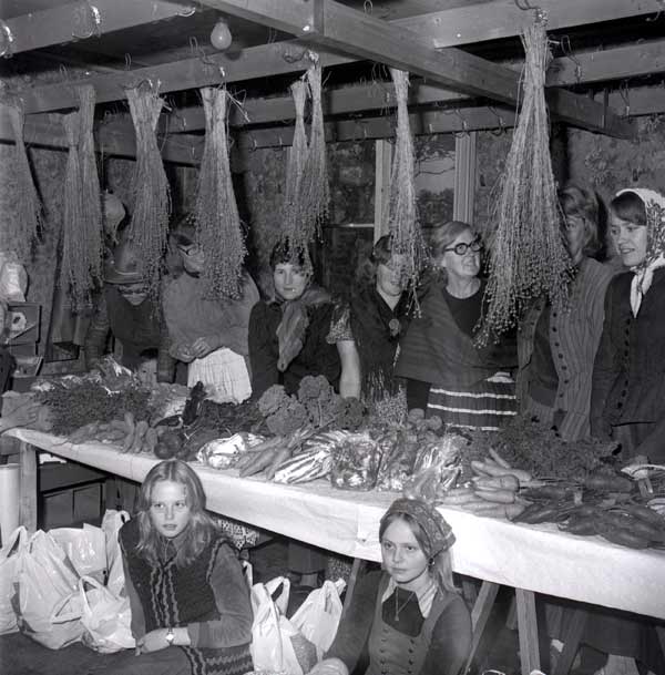 Bildtext: Skördemarknad på bygdegården. Från vänster stående: Okänd, Okänd, Alva Albinsson, Anna Lisa Viktorsson, Anna Persson, Okänd och ? Blomqvist. Framför ståndet sitter: Margareta Åkesdotter och Annelie Gunnarsson