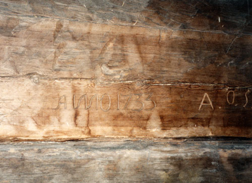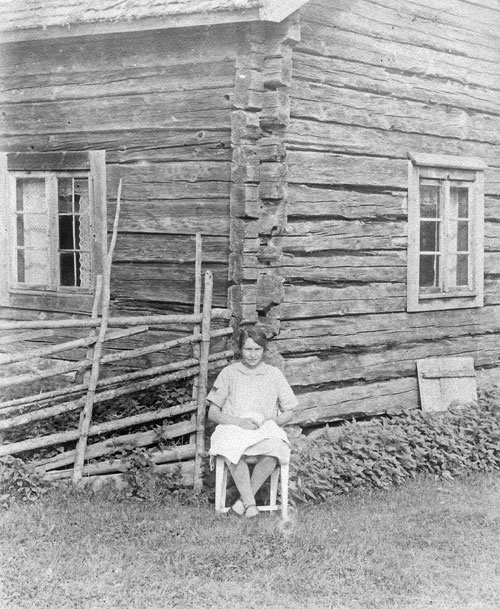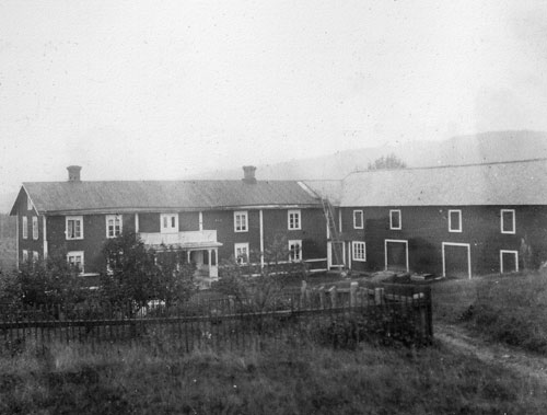 Bildtext: Wedins gård i Matnäs. Kristina Lusth, Kristina Persson och C. J. Lusth. Förstoring år 1919. Märk att landsvägen gick nere i nivå med grinden.