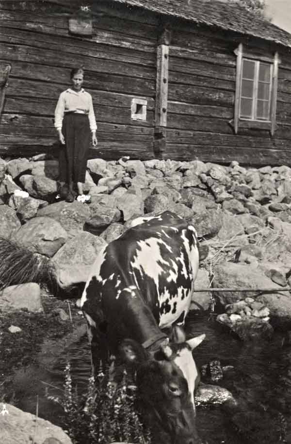 Erik Mood med Alfred Västs häst. Alfred bodde granne i Tomta i huset ovanför "Lill-Jonke". Huset revs 1997.