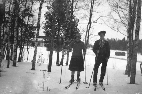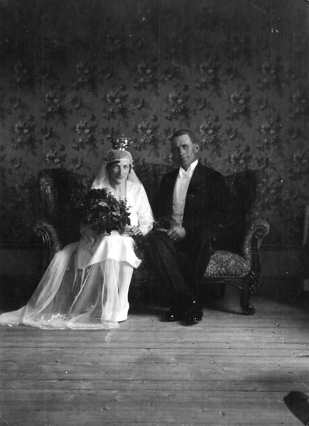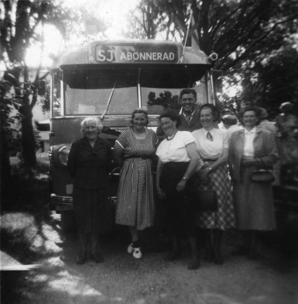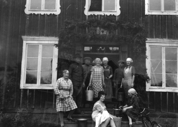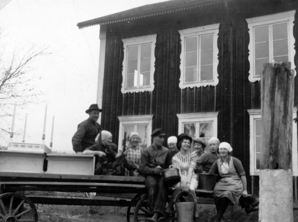 Bildtext: Slåtter 1928. Hästen heter Odin. Från vä: Lill-Johan Olsson, Ester Johansson, Olle Sandström, Svea i Utnäs, Jan-Jans Axel och uppe på lasset Lill-Pelle Per Larsson (kvastmakare)