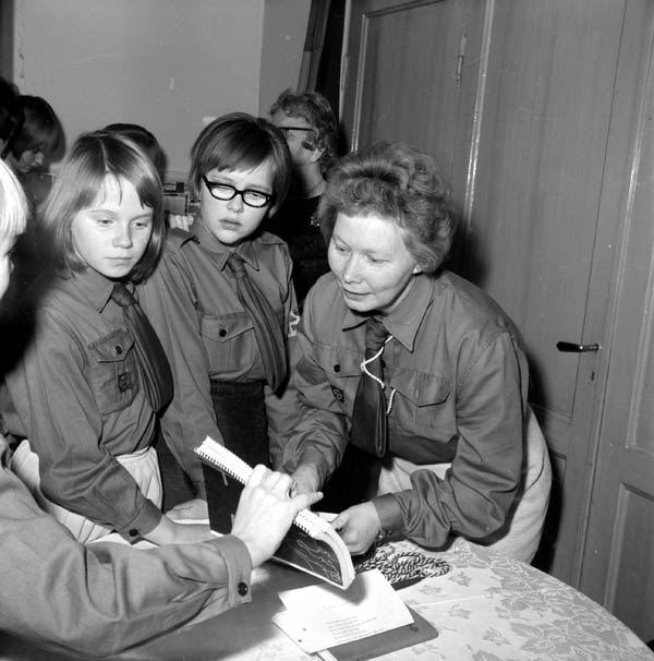 Bildtext: Scouter i Backa missionshus. Monika Jonsson, Solgerd Sand, Staffan Nyman (även lärare på Trogsta skola) Astrid Rask, Birgitta Svedman, Siv Rahm och Lena Karlsson