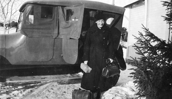 Bildtext: Dyngkörningen med T-Ford, se text alb-C-36. Från vänster: Olof Hed d.ä. och sonen Olle Hed. Regestreringsnummer X 2435. De körde gödsel över isen från Norrgården, Fränö till jordbruksmarken på Ön.