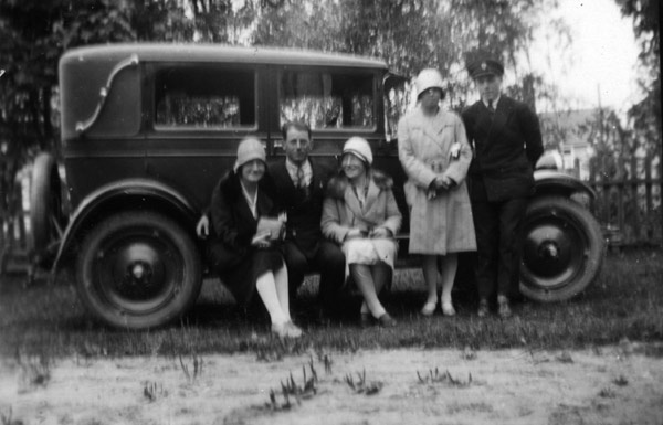 Morfar Lars Johan Larsson, LJ Larsson, född i Njutånger 1871 avled i Forsa 1941. Familjen flyttade till Sörforsa (Lunds by) i början på 1920-talet och övertog den affär som då blev ”LJ Larssons Diversehandel”. Bilden visar morfar med sin troligen första bil ca 1920 av okänt fabrikat med karbidlyktor. Lite oklart vilka passagerarna är. Morfars körkort är daterat 1919 så bilden är troligen från sommaren 1920, kanske innan flytten till Forsa. / Lars Svärd