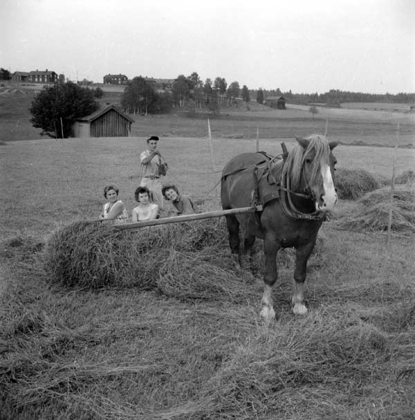 Slåtter i Trogsta. Från vänster: Ingvor Sundfors Olsson, Margit, Kajsi/Karin Andersson född Olsson, Tövsätter och det är Bång-Gunnar Viktorsson vid tömmarna. Hästen hette för övrigt Strålina och var från Ol-Ers.