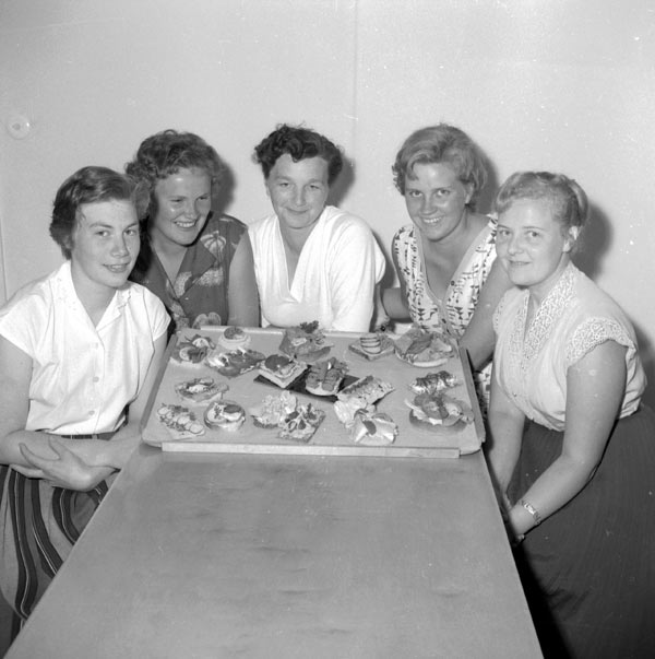 Från vänster: Karin Carlsson född Olsson i Sörgårn Trogsta, Karin Melander (född Olsson) från Utnäs, Rut Svensson Tövsätter gift med Gösta, Ingvor Sundfors Olsson född i Ol-Ers, Trogsta och Sally Eklind född Hermansson i Trogsta. Smörgåstävling.