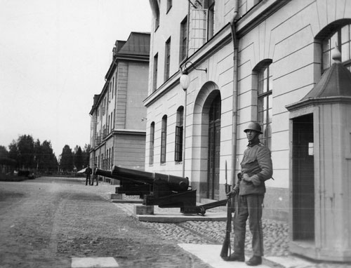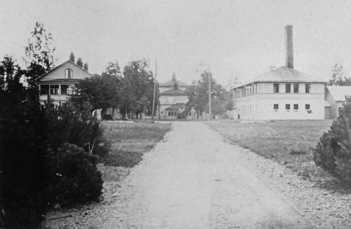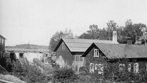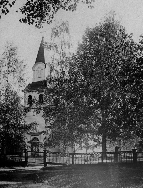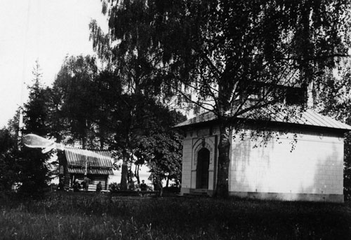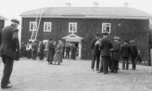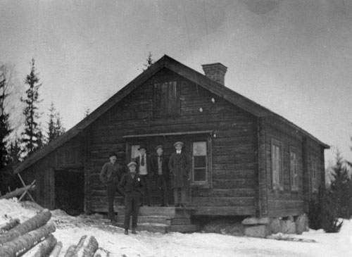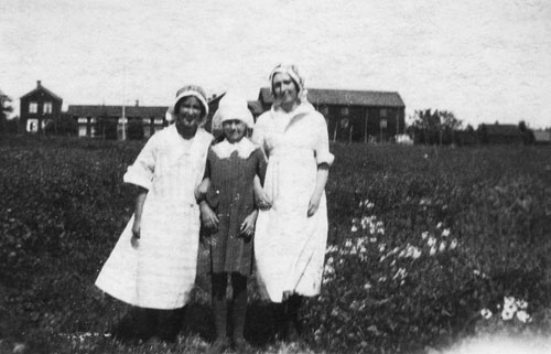 Bildtext: Vy från Heds, Forngården i Fränö. Förmodligen besökare hos Heds. På sommaren hade Heds ibland besök av borgare från Hudiksvall som ville ut på landet. De ser ut att tillhöra en stadsfamilj.