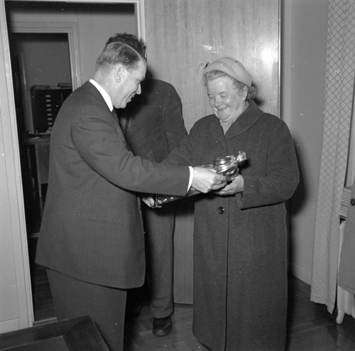 Bildtext: Linspinneriet, trotjänaren och spinnerskan Alma Swahn får sin efterlängtade guldpendyl.