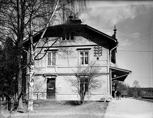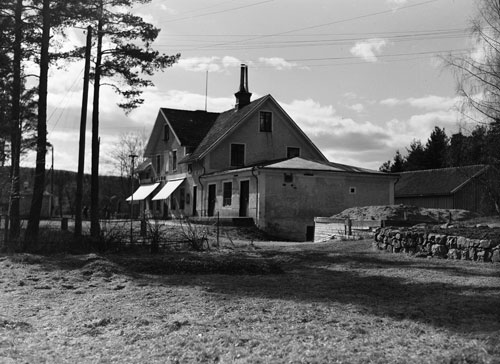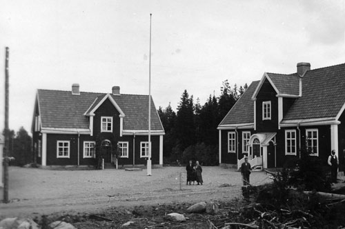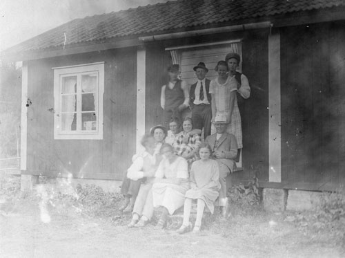 Bildtext: Udéns affär i Sörforsa. Sortering av ransoneringskuponger under 1:a världskriget (1914-18). Fr. v. Einar Lindström, bodbiträde (okänd), Kristina Udén, Anna Andersdotter (syster till Kristina Udén) och Per Udén. Einar Lindström, bodbiträde, gifte sig med Linnéa Udén, dotter till Kristina och Per Udén. Per Udén (d. 1947) drev handelsboden i Sörforsa, kom från Enånger där han varit sågverksarbetare. Per Udén drev också bageri nära handelsboden, ägde fäbod med mark på "Ön" samt skogsskiften vid Skarmyra vari ingick Nyvallen. Kristina, hustru till Per Udén, f. Andersdotter från Sörgården, dotter till Anders Larsson. Hustrun död 1948. Tack Brita-Stina Lugn (barnbarn till Kristina och Per Udén) för foto och information.