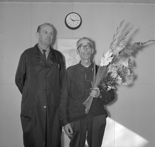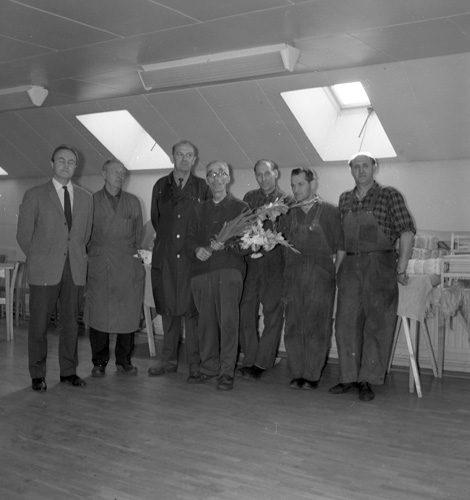 Bildtext: Herman Lindh har fått blommor. På bilden fr.vänster Helmut Kaulich, Evert Petersson, Lund, Göran Johansson, Herman Lindh, Ragnar Larsson, Arnold Olsson och P.Tärneborg